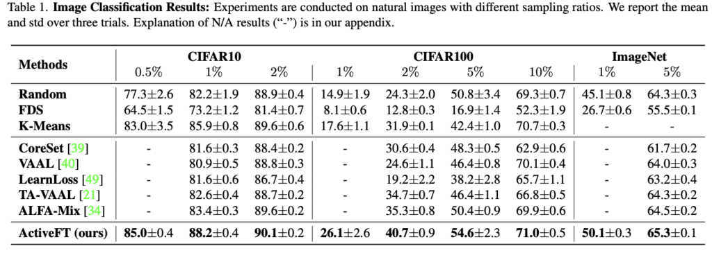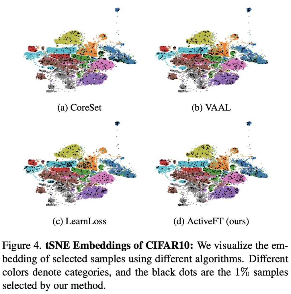 다음으로 CIFAR-10에 대한 피처 시각화 결과를 상단 [그림 4]에서 확인할 수 있습니다. 검은색 점이 바로 각각 다른 방법으로 선택된 1% 샘플인데요. 그 결과는 ActiveFT에서 선택한 샘플이 다른 샘플보다 피처 스페이스에서 전체 풀과 더 유사하게 분포한다는 것을 정성적으로 확인할 수 있었습니다. 이를 통해 저자가 제안하는 최적화 기법이 전체 풀을 반영하는 데에 효과적일 수 있었다 라고 합니다.