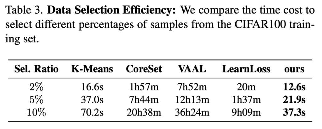 저자는 특히 시간적 효율성에도 집중하였는데요, 이에 대해 ‘Data Selection Metric은 가능한 한 랜덤 선택에 가깝도록 시간 효율적인 방식으로 진행되어야 한다’ 라고 주장하였습니다. 특히 [Table 3]에서는 CIFAR100를 다양한 비율의 샘플을 선택하는 데 필요한 시간을 비교하였습니다. (여기서 FDS는 성능 좋지 않아서 비교 대상에서는 제거하였다고 합니다.)