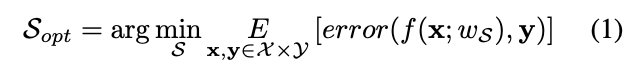데이터를 선택하는 데에는 Supervised learnign으로 학습된 모델 f를 사용합니다. 기존의 Unlabeled pool 전체 데이터셋을 학습하는 Self-supervised learning 모델 f는 전체 데이터셋의 분포를 잘 표현해낼 수 있기 때문이죠. 따라서 이 모델을 사용해서 S_{opt}을 구하고자 하엿습니다. 이 S_{opt}는 하단[수식 1]과 같이 모델의 오차 error(f(x;w_S),y)를 최소화하는 것으로 정의됩니다.