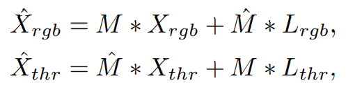 X_{rgb}, X_{thr}은 각각 토큰화된 입력 이미지이고, M은 random mask, \hat{M}은 complementary mask이며 1-M으로 단순하게 계산됩니다. 그리고 L_{rgb}, L_{thr}은 각각 rgb, thermal의 learnable token vector를 의미합니다.
