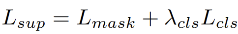 또한 저자는 이 뿐만 아니라 Mask2Former에서 사용하는 loss를 사용하여 사용하였다고 합니다. 해당 논문을 읽어보지 않아 깊게는 모르겠지만 Facebook AI Reasearch 팀에서 작년 CVPR에 낸 논문이네요. 조만간 한번 읽어보고 리뷰를 작성해봐야겠습니다. 암튼 Mask2Former에서 사용하는 supervised loss는 아래와 같습니다. binary mask loss와 classification loss의 결합으로 구성되어 있네요.