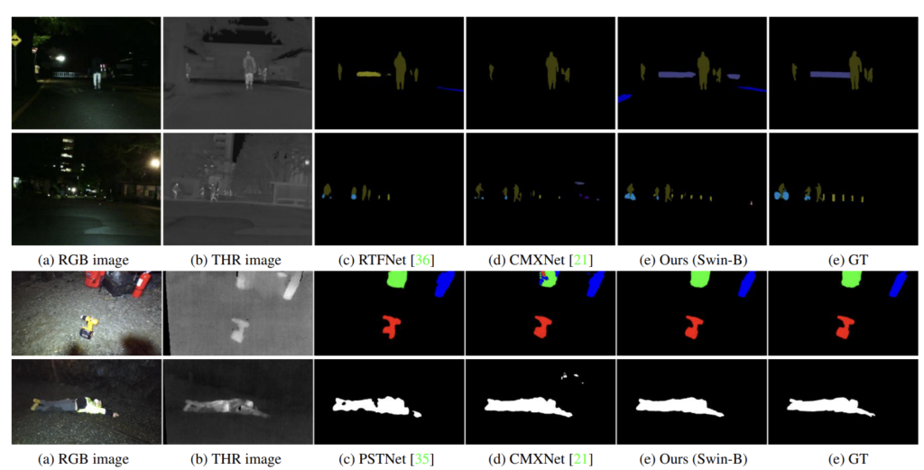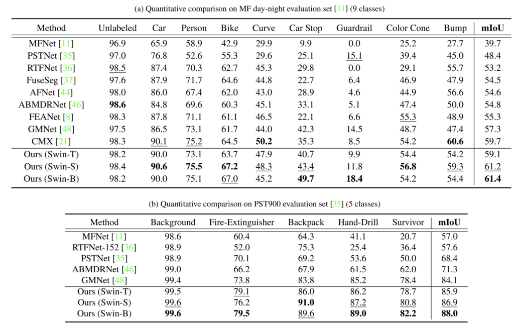본 논문에서는 MF Dataset, PST900 Dataset, Kaist Dataset 이렇게 3개를 사용하여 벤치마킹을 수행합니다. 모두 RGB-Thermal pair로 구성되어 있습니다. MF와 Kaist 의 경우는 Urban 환경에서 driving scene 위주로 구성되어 있고, PST900 Dataset은 동굴 및 지하 환경에서 촬영된 데이터셋이라고 합니다.