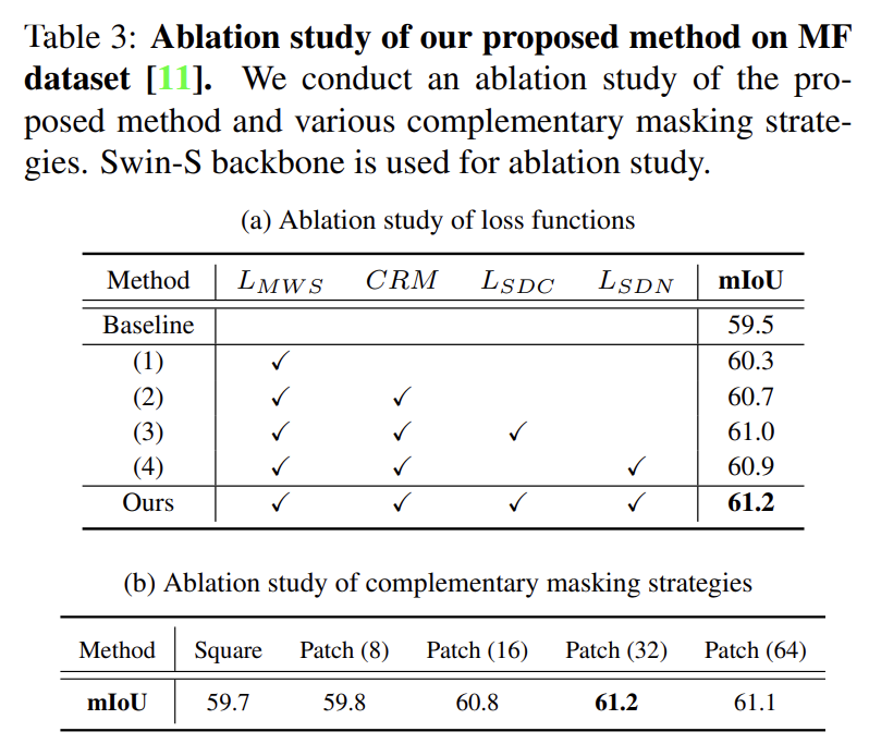 3. 첫 번째 기법은 RGB-Thermal image에 complementary random masking을 가해 augment하여 모델이 특정 도메인에 과도하게 의존하는 것을 방지하는 것입니다. 이를 통해 의존성 뿐만 아니라 전체적인 성능이 향상됩니다.
