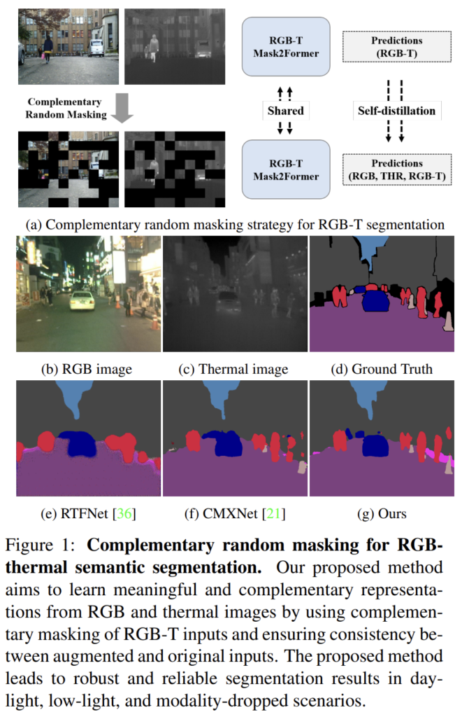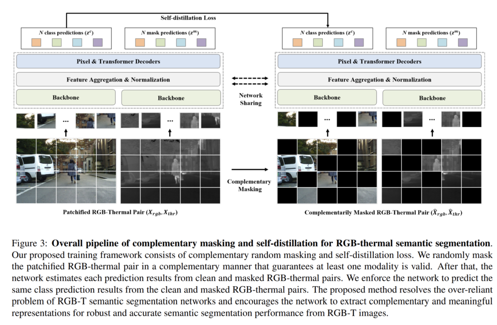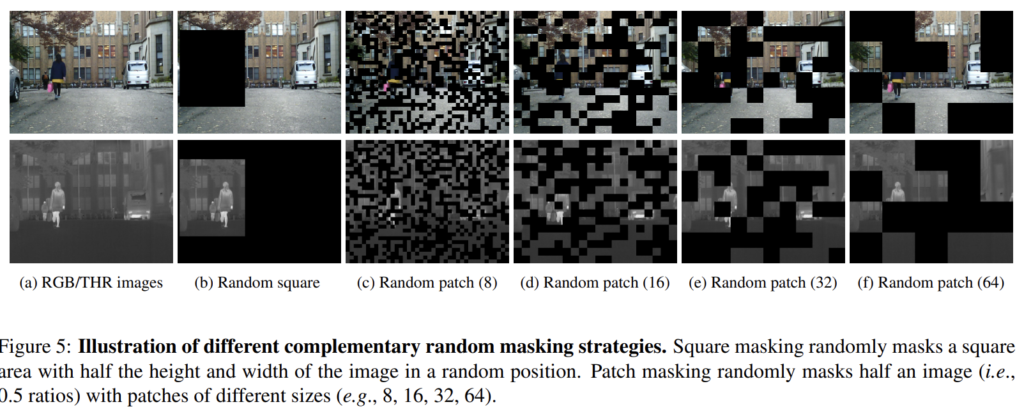 우선 RGB-Thermal 이미지를 무작위 마스킹(Random masking)으로 보강(augment) 하여 모델이 한 가지 모달리티에 과도하게 의존하는 것을 방지합니다. 이를 통해 단일 모달 의존성을 줄일 뿐만 아니라, 전체적인 성능을 향상시켰다고 하네요.