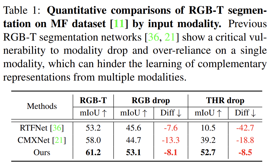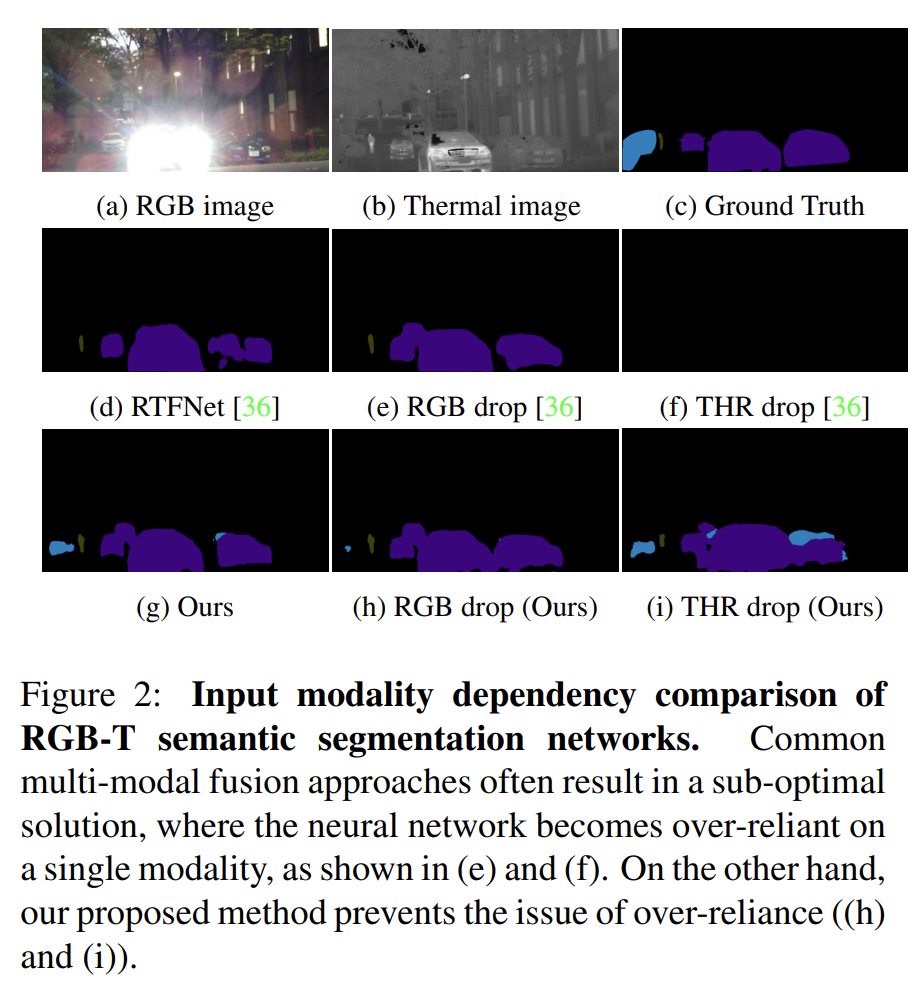 하지만 저자는 여기서 기존 연구들에 대한 문제 제기를 하게 됩니다. 기존 연구들이 대부분 RGB, Thermal 멀티모달 입력의 특성을 각각 고려하지 않고, 그저 fusion하는 module을 설계하기에만 급급하다는 것이지요. 이 때문에 예측이 단일 모달리티에 지나치게 의존하는 현상이 발생하여 서로의 장단점을 보완하지 못하고 의미있는 표현 또한 학습하지 못한다고 합니다.