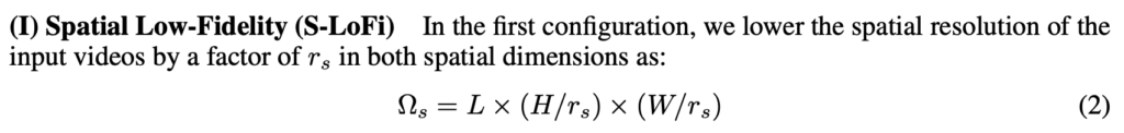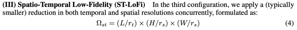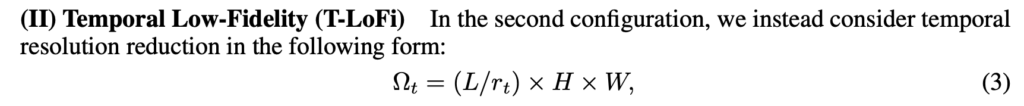 Temporal Low-Fidelity는 Temporal 축에 대해서 scaling을 진행합니다. 사실 그냥 프레임을 뽑을 때 비디오 전체를 보는게 아니라 비디오의 일부 구간만을 샘플링한다고 생각하시면 됩니다. 예를 들어 100초짜리 비디오가 있다면 그 중 5초 정도만 사용하는 것이죠. 당연히 데이터를 적게 사용하니 역시나 memory 관점에서 이득이 있습니다.
