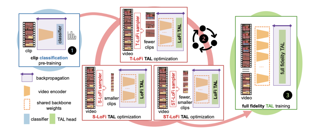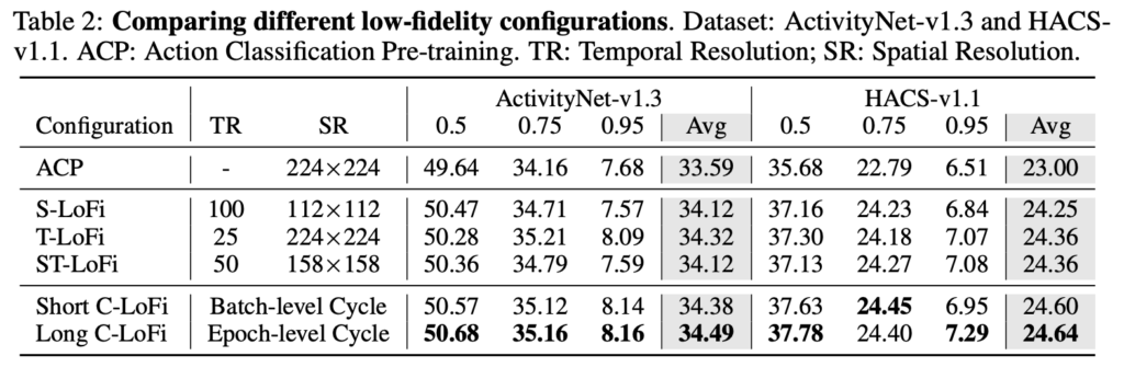 LoFi의 핵심은 입력으로 들어가는 데이터의 spatial resolution이나 temporal length를 인위적으로 줄여서 GPU memory를 아끼는 것 입니다. Classification으로 사전학습이 끝나고 Localization Head를 fine tune 하기전에 LoFi 방식으로 End-to-End 방식으로 학습 시켜야 task discrepency를 해결할 수 있다는 것이죠.