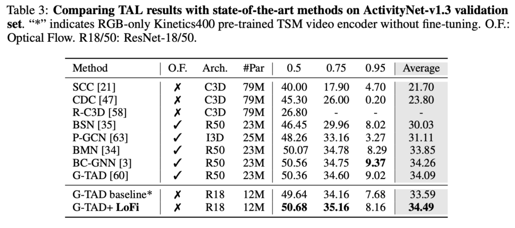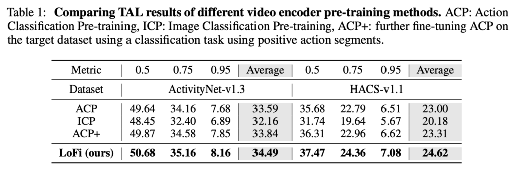 직접적인 비교는 ACP+와 LoFi를 하는 것이 fair 합니다. 결국 LoFi를 학습하는 과정에서 ActivityNet을 사용했기 때문이죠.