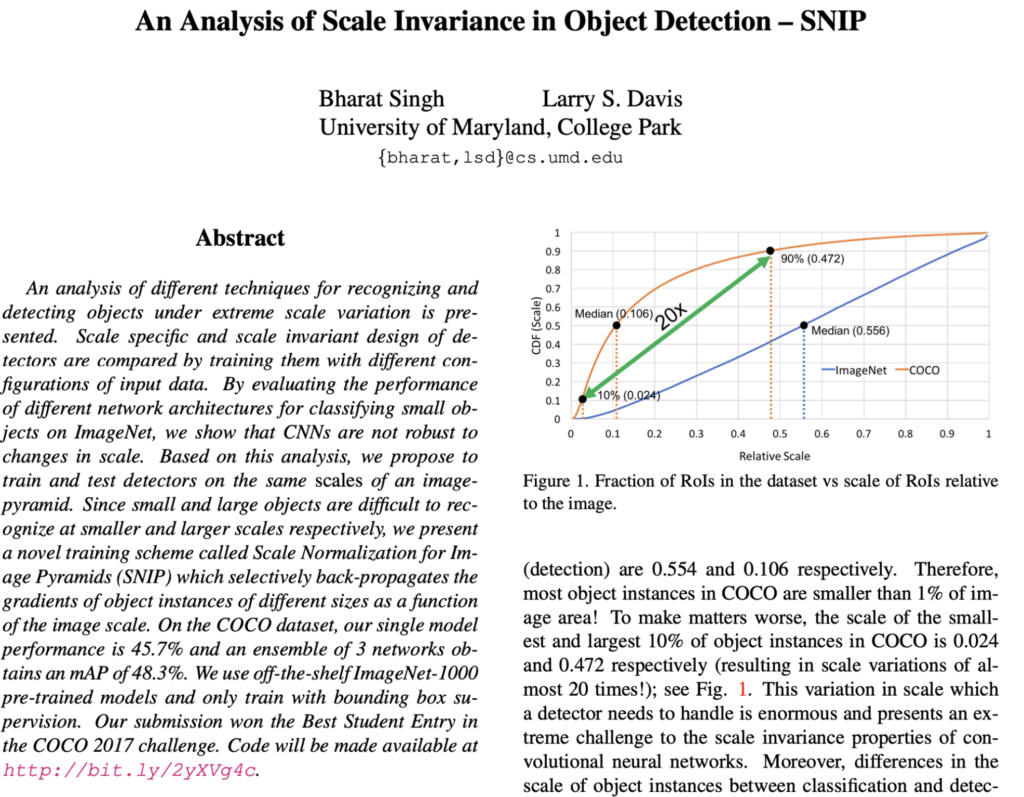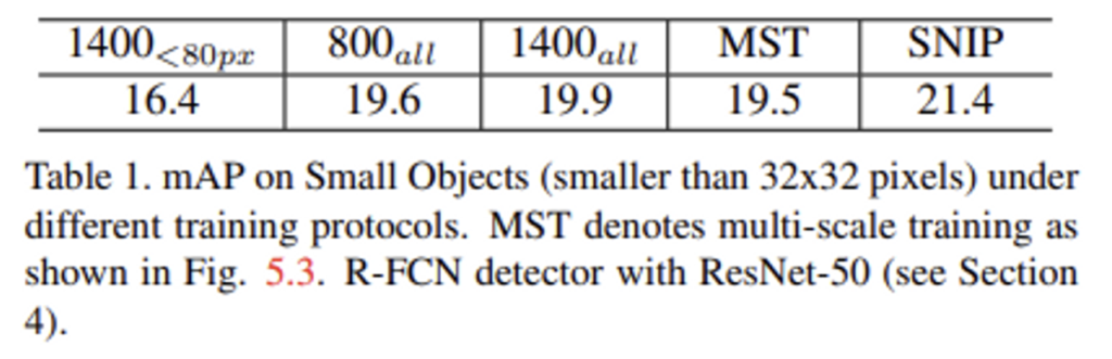 이러한 실험들의 결론으로 논문에서는 object 간에 가능한 한 많은 variation을 가져가면서 그와 동시에 적절한 scale로 training하는 것이 중요하다고 판단하며 Scale Normalization for Image Pyramids(SNIP) 방법론(5.4)을 제안합니다.