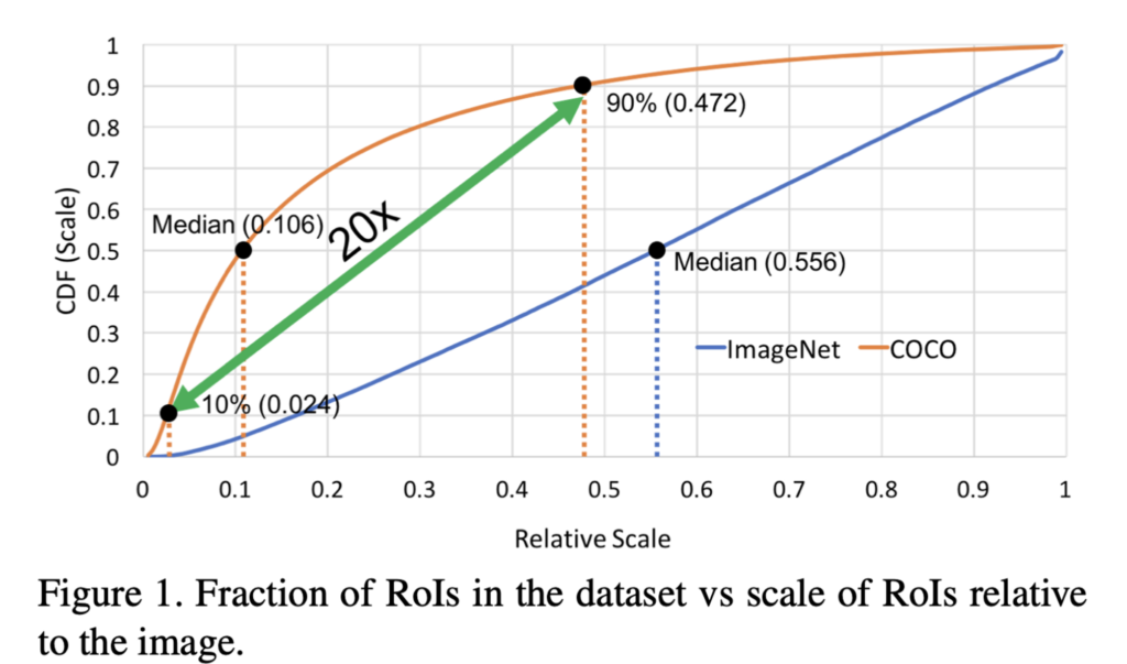 그래프를 보시면 COCO dataset(주황색)의 전반적인 Object가 small Object라는 것과(Median이 0.106), object간의 scale variation이 20배 정도로 굉장히 크다는 것을 볼 수 있습니다. 또한 두 dataset의 scale에 있어서 large domain-shift가 존재합니다. 두 데이터간 domain shift가 문제가 되는 이유는 보통 detection model에서는 ImageNet으로 pre-trained된 model을 backbone으로 사용하는 경우가 많기에, 이때 ImageNet과 MSCOCO 사이의 domain shift로 인하여 성능에 영향을 미칠 수 있기 때문입니다.