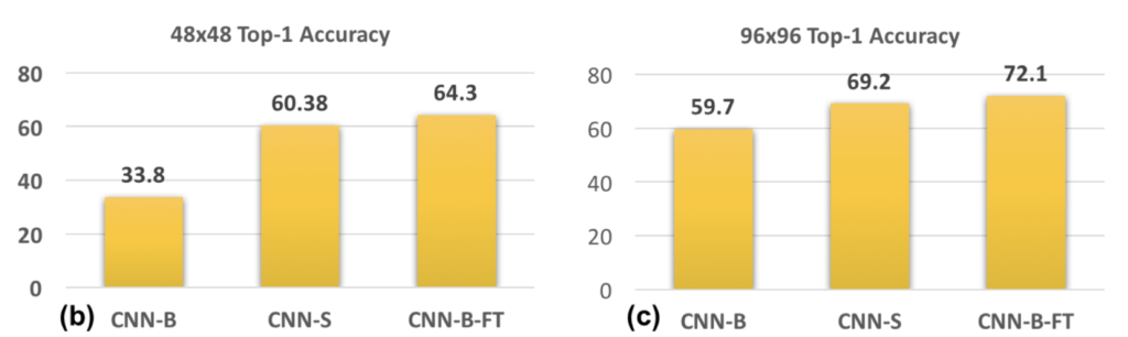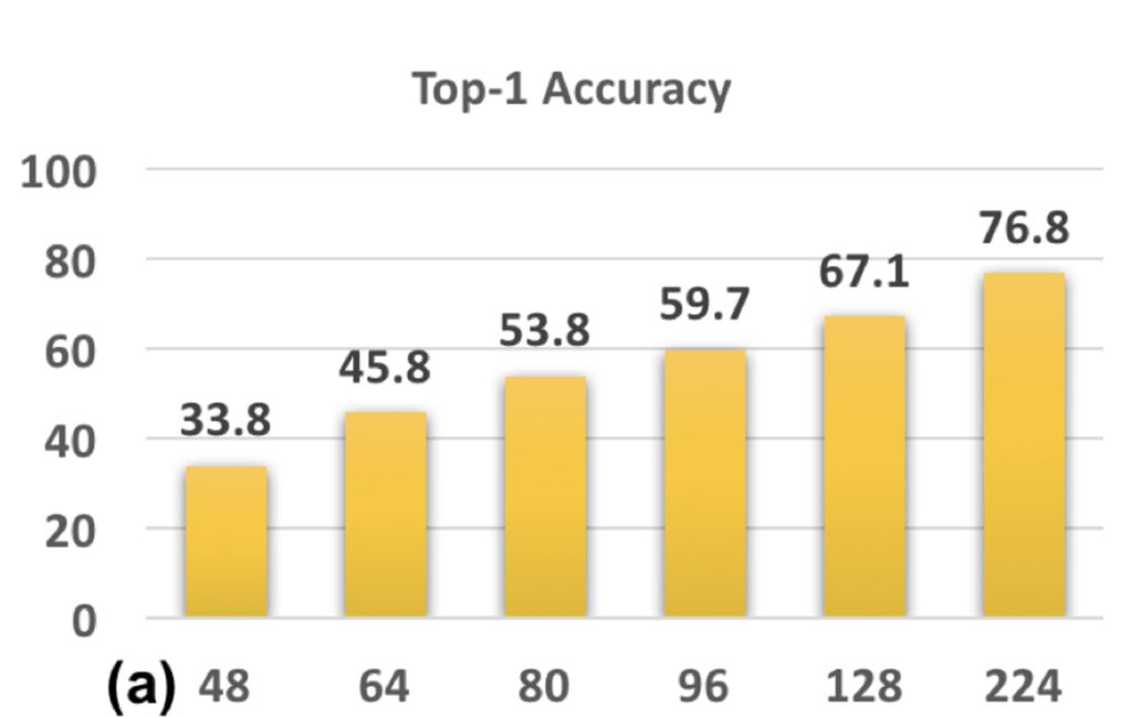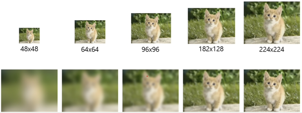 위의 그림과 같이 원본 이미지(224×224)를 48×48, 64×64, 80×80, 96×96, 128×128로 down-sampling하고 이를 다시 224×224로 up-sampling합니다. 이렇게 up-sampling된 이미지는 224×224의 원본 이미지로 학습된 CNN 모델에 input으로 집어넣어 accuracy를 확인해보고자 합니다.