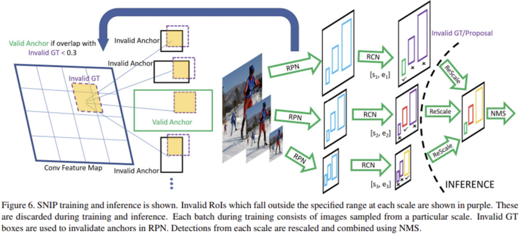 SNIP의 학습 과정을 살펴보면, 위 그림과 같이 Image Pyramid를 만들어놓고 RPN을 통해 서로 다른 resolution을 가진 이미지(1400×1200, 800×1200, 480×800)에서 각각의 Region Proposal을 뽑아냅니다. 그리고 뽑아낸 region proposal의 면적이 미리 설정해둔 특정 range안에 들어가는 것만 유효한 region proposal로 골라냅니다. (1400×1200에서는 [0, 80], 800×1200에서는 [40, 160], 480×800에서는 [120, ∞]) Backpropagation 과정에서도 이렇게 유효한 범위 내에서 뽑힌 것들로만 사용하여 학습을 진행하며, test 할 때는 마찬가지로 각 resolution에서 RPN을 사용하여 proposal을 생성하고, 범위 안에 해당하는 proposal들만 rescale하여 soft-NMS를 사용하여 detect하게 됩니다.