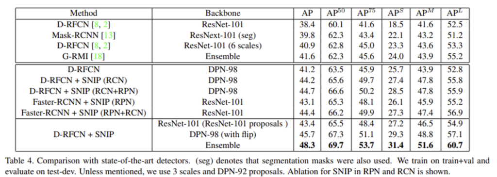 결국 앞단의 실험을 통해 이 논문이 제안하는 것은 scale variation을 줄이기 위해 image pyramid 상에서 scale normalization을 하자는 것인데, 간단히 말하자면 작은 이미지에서는 large object를, 중간 크기의 이미지에서는 medium object, 큰 이미지에서는 small object를 학습시키는 것입니다. 이에 대한 성능으로는 위의 표를 보시면 21.4%로 이전의 실험들의 성능을 능가합니다.