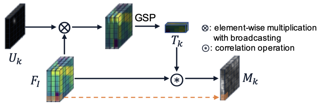 - Correlation 연산 이후, GSP (Global Sum Pooling)을 통해 Template Vector T_K 를 만듭니다.