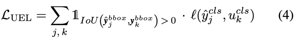 이제, 마지막 Method입니다. User-input Enforcing Loss (UEL)은 User가 object에 대해 특정 클래스로 명하면, C3Det이 예측 결과에 이를 반영하기 위한 Loss입니다. 그렇기에 개념이 단순하죠. 해당 Loss를 통해 User (Annotator)와 Model이 정보를 상호교환하고 있음을 알 수 있습니다. 일전에 우리가 Training-time consistency loss에 대해 설명드리며, User input과 Model prediction 간의 균형을 맞추기 위해 고안되었다고 설명드렸는데, UEL은 클래스와 관련되어, 유저가 특정 클래스를 명명한 결과에 따라 클래스별 균형을 이루는 효과를 가져옵니다. User input을 \left (u^{pos}_k, u^{cls}_k \right) 이라고 할 때, 해당 input과 연관된 ground-truth bounding box인 y^{bbox}_k 를 찾을 수 있습니다. 이는 모든 ground-truth object를 모든 예측 객체 J와 비교하는 방법으로, 각 예측은 당연히 bounding box와 class로 구성됩니다. 해당 방식으로 loss를 구성하며 IoU를 통해 non-zero를 확인한 다음, 해당 클래스에 대해 class-consistency loss를 적용합니다. 아래의 수식을 통해 이해할 수 있습니다.