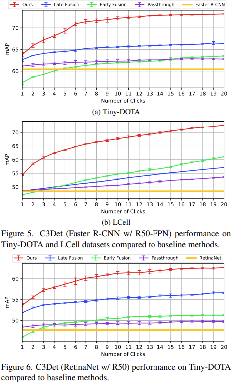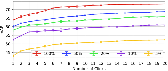 이는 곧 Annotator가 이미지 내 한 번 클릭을 하는지, 두 번 클릭을 하는지에 따라 모델이 출력을 뱉는 수준이 다를테며, 그러니 Detection 모델에서 mAP가 달라지겠죠. 마우스 클릭 수를 1 – 20으로 늘리며 평가했을 때, 1-Stage (Faster-RCNN w/ R50-FPN)와 2-stage (RetinaNet w/ R50)에서 유의미한 성능 향상을 보입니다. Interactive한 특성 상 또한 학습 데이터가 많을 수록 성능이 늘어나는 특성 상, 클릭 수가 늘어나면 성능이 높아지는 것은 당연한 일이지만, 다른 방법론과 비교하면 굉장히 높은 수치로 늘어남을 알 수 있습니다.