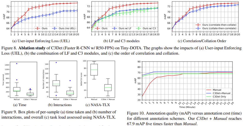 마지막으로는 다양한 Ablation Study입니다. (결국 모든 실험을 다 들고오게 되었네요) 해당 실험은 저자가 제안한 세 모듈을 추가했을 때의 실험이며, 추가적으로 Annotation time과 Annotation Manual (NASA-TLX)을 따른 방법을 적용했을 때의 Time, Interaction입니다. 간단히 살펴보고만 넘어가면 될 것 같습니다.