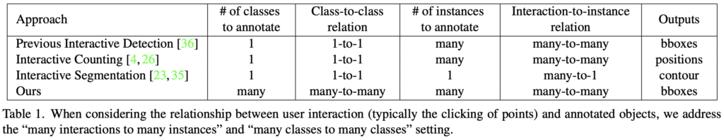 하지만 이러한 접근법은 Annotator들이 하나의 객체에만 집중하게끔 만들어 놓치는 부분들이 몇몇 있을 수 있습니다. 예를 들어 이미지 내 동그라미와 네모가 다수 존재할 때, 동그라미에 대해 interactive bounding box generation을 수행하고 있다면, Annotator들은 interaction의 대상을 동그라미에 한정하게되는 편향 (one classes to one classes)이 있습니다. 그러므로 저자는 이전의 many-to-one 혹은 many-to-many가 아닌 새로운 “many classes to many classes”로 접근해야한다고 주장합니다. 아래의 표에 잘 정리되어 있습니다.