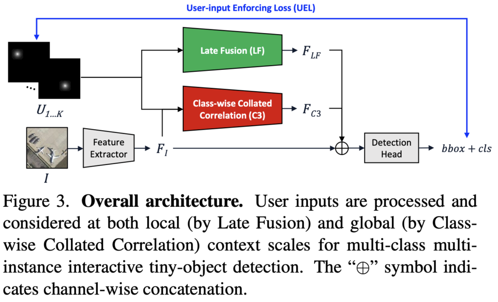 위의 1-4 과정을 담은 그림이 위의 Figure 1. 입니다. 해당 그림을 통해 더욱 자세히 이해할 수 있으며, 저자의 해당 접근 방식에 대한 주요 측면을 살펴보겠습니다. 우선, 2의 Annotator가 정보를 주지 않은 객체들에 대한 Bounding box를 검출하는 측면이 주요한 것으로 보입니다. 만약 Annotator가 객체 중심점에 점을 찍은 이후 정보를 주었다면, CNN 연산의 특징을 생각해봤을 때 근처 부위의 맥락 (Local context)에 대해서는 풍부하지만, 비교적 먼 위치의 동일 객체에 대해서는 그러지 못합니다. 그러므로 저자는 이러한 점을 극복하고자 C3 (Class-wise Collated Correlation) Module을 제안합니다. 해당 모듈은 방법론에서 다시 살펴보도록 하겠습니다.