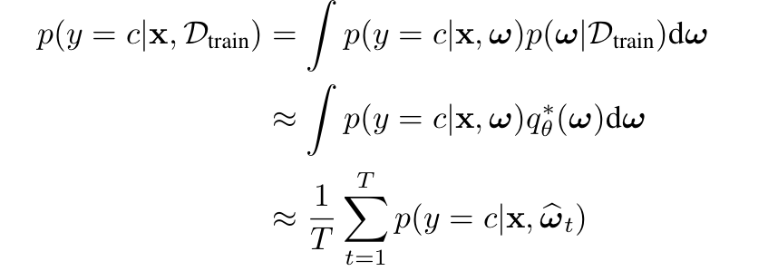 좀 더 공식적으로 학습방식에 대해 접근해봅시다. Train dataset D_{train}가 주어졌을 때, 실제 모델 posterior p(ω|D_{train})에 대한 KL-divergence를 최소화하는 학습 가능한 distribution q_θ^∗(ω)를 찾는 것과 동일합니다. 여기서 dropout 은 variational Bayesian approximation로 해석할 수 있는데, approximating distribution는 분산이 작은 두 가우스 분포가 혼합되어 있고 가우스 분포 중 하나의 평균은 0으로 고정되어 있습니다. 따라서 가중치의 불확실성은 몬테카를로 적분을 사용하여 posterior에 대한 예측 불확실성을 유도할 수 있다고 합니다. 이에 대한 수식은 아래와 같습니다. 결국 이러한 이유로 저자는 BCNN이라는 구조를 사용하여 불확실성을 유도하고자 하였습니다.