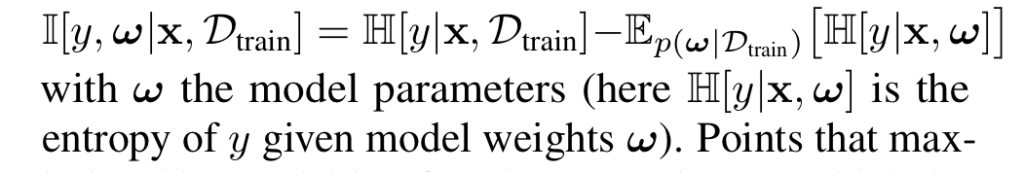 2. BALD라고 불리는 모델 파라미터에 대해 얻은 정보를 최대화할 것으로 예상되는 데이터를 선택하는 기법입니다. 이를 위해 예측과 모델 posterior 분포 사이의 상호 정보량을 최대화하는 방식입니다.