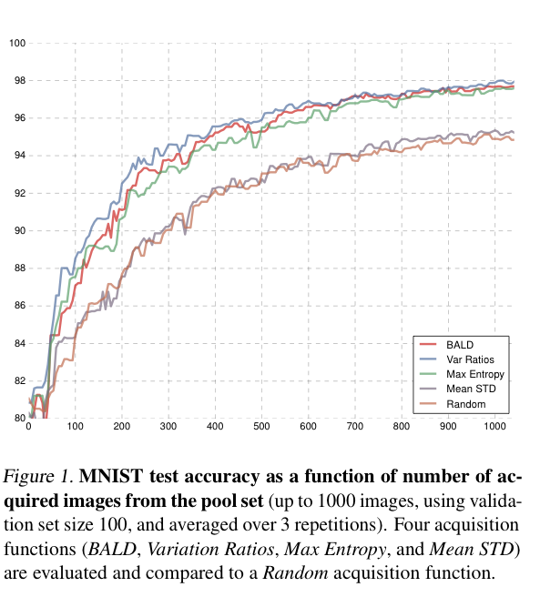 앞서 언급한 acquisition function들을 비교하기 위해 MNIST에 대한 실험 결과를 보여드리겠습니다. 신기하게 이 당시에는 모델 구조를 하나하나 서술을 하네요ㅎㅎ: convolution-relu- convolution-relu-max pooling-dropout-dense-relu-dropout- dense-softmax, with 32 convolution kernels, 4×4 kernel size, 2×2 pooling, dense layer with 128 units, and dropout proba- bilities 0.25 and 0.5