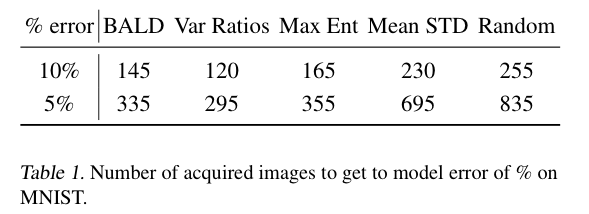 실험으로는 앞섹션에서 설명한 5개의 acquisition 함수들인 BALD, Var Ratio, Max Entropy, Mean STd, 그리ㅗㄱ ranodm을 비교하였습니다. 그 결과 아래 [그림 1]과 같이 Random과 mean STD는 BALD, Variation Ratios, Max Entropy에 비해 성능이 떨어지는 것으로 나타났습니다. Variation Ratios는 BALD 와 최대 엔트로피보다 더 빨리 높은 성능을 보입니다. 무작위로 샘플링하는 Random과 mean STD가 비슷한 성능을 보이는 것도 인상깊었습니다. 마지막으로 [표 1]에서는 5%와 10%의 테스트 오류에 도달하는 데 필요한 단계 수를 제공합니다. 표에서 볼 수 있듯이 BALD, Variation Ratios 및 최대 엔트로피는 mean STD 및 random보다 훨씬 적은 수의 데이터셋으로도 적은 오류를 달성하였습니다. 이 표는 결국 데이터 효율성의 중요성을 보여준다고 할 수 있습니다. 예를 들어 Variation Ratios 모델을 사용하는 전문가는 random하게 새 이미지를 얻을 경우 라벨링해야 하는 이미지 수의 절반도 채 되지 않기 때문이죠.