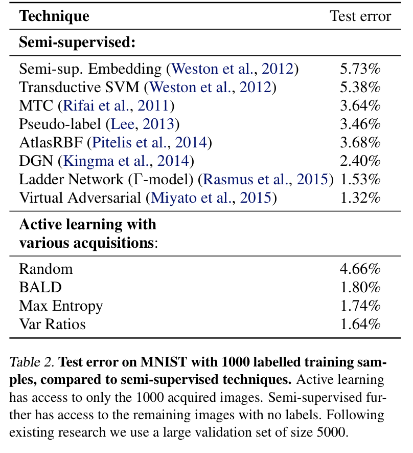 이제 본격적으로 BCNN을 적용한 Active Learning 결과에 대해 리포팅하는 섹션입니다. 베이지안 CNN 불확실성을 기반으로 하는 다양한 acquisition function 들을 간단한 이미지 분류 결과와 함께 동일한 acquisition function를 결정론적인 CNN에서 모델의 불확실성 중요성을 살펴보았습니다. 다음으로 SVM을 기반으로 한 이미지 데이터의 그 당시 활발하게 제안된 학습 기법과 비교하였지만, 저는 본 리뷰에서는 다루진 않겠습니다. 뿐만아니라 저자는 semi-supervised learning 기법과도 비교합니다. 이러한 학습 기법은 Active Learning 모델보다 훨씬 많은 데이터(unlabeled data)에 접근할 수 있지만, 비교적 유사한 결과를 보였다고 합니다.
