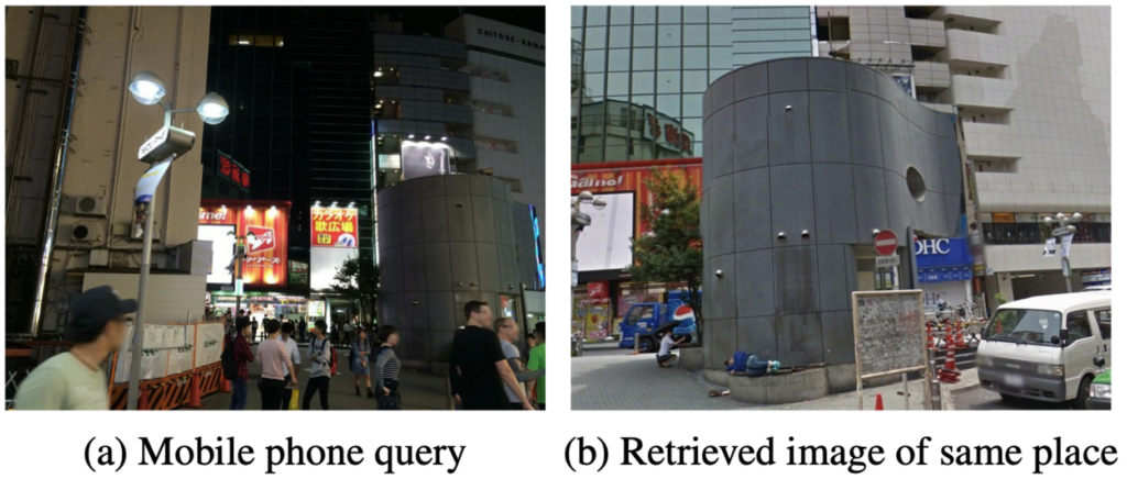 Visual Place Recognition(VPR)은 영상이나 이미지를 기반으로 장소를 인식하고 식별하는 task이며, 일반적으로 qeury image와 database image를 비교하여 가장 유사한 image의 위치를 이용하여 query image의 location을 추정합니다. ((a)와 유사한 이미지인 (b)를 찾아냄)