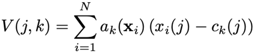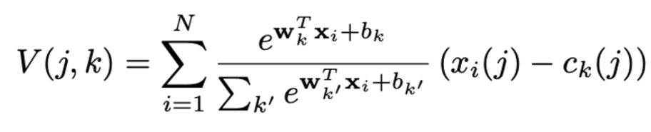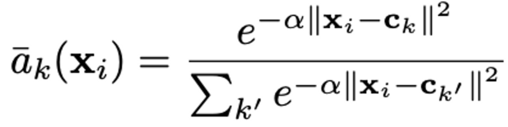 이를 통해 descriptor x_{i}의 weight는 여러 cluster 중심과의 근접성에 비례하게 가져가게 됩니다. a_{k}(\mathbf{x}_i)의 범위는 0에서 1 사이의 범위이며, 가장 가까운 클러스터 중심에 가장 높은 가중치가 할당됩니다.