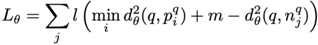 query image q와 가장 가까운 potential image와의 거리 + margin 값이 query image q와 j번째 negative image 거리보다 작다면 l(x) = max(x, 0)이기에 loss는 0이 됩니다. 즉, query image와 가장 가까운 이미지 거리가 모든 negative image와의 거리보다 작아지는 방향으로 학습하게 되는 것입니다.