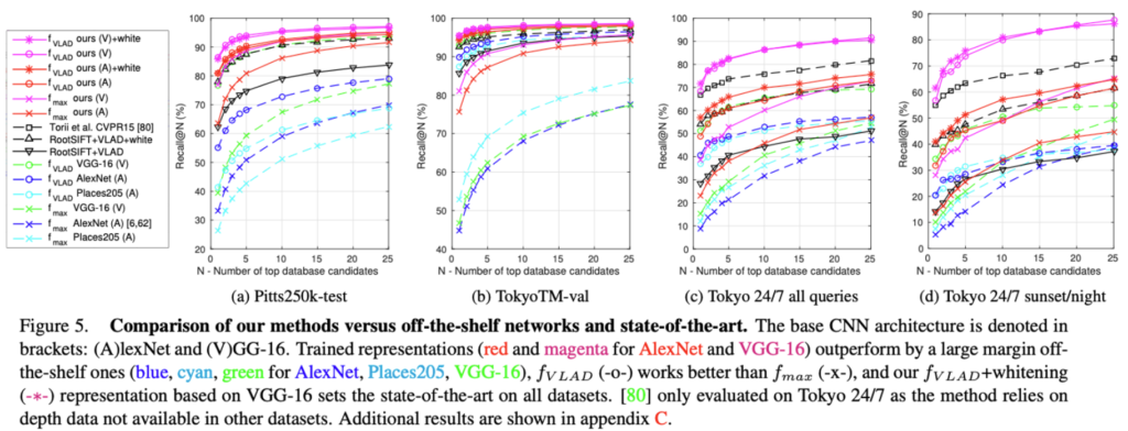실험 결과[Fig 5]를 살펴보면, PCA를 이용하여 4096 Dimension으로 차원 축소를 한 것(-∗-)과 하지 않은 full size vector(-o-)의 성능 차이가 거의 없는 것을 확인할 수 있으며, whitening을 적용한 VGG-16 base의 f_{VLAD}representation(magenta -∗-)가 SOTA를 달성했던 방법론인 Root-SIFT+VLAD+whitening보다 더 좋은 성능을 낸 것을 볼 수 있습니다.