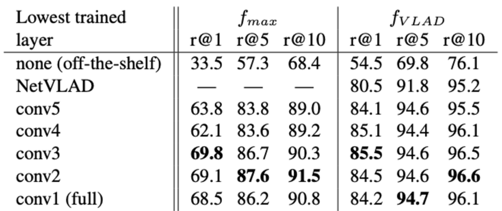 위의 표는 어떤 layer를 학습시켜야 하는지에 관하여 실험한 결과입니다. none (off-the-shelf)와 비교하였을 때 NetVLAD layer만을 학습시키는 것만이 (conv layer는 freeze한 채로) 가장 큰 성능 향상 폭을 보였지만 추가적으로 convolution layer를 학습시키면 성능이 개선되었습니다. 다만 마지막 행인 conv1 (full)을 보면 (conv1만 freeze하고 나머지 layer는 학습) overfitting으로 인해 조금 성능이 떨어지네요.