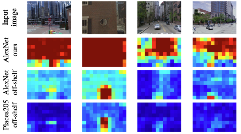 위는 각 모델이 입력 이미지의 어떤 부분에 focus하여 학습을 한 것인지 heatmap으로 시각화한 것입니다. off-the-shelf AlexNet은 ImageNet category인 12가지의 ball type을 구별하기 위해 circular blob과 같은 것에 focus한 것을 볼 수 있다고 합니다. (ball type이 뭔지는 잘 모르겠습니다만 , , ,) 위의 두 결과와 비교하여 저자가 제안한 모델(AlexNet ours)은 자동차나 사람 같은 confusing feature들을 무시하며, building facade와 skyline 등에 focus하고 있습니다.