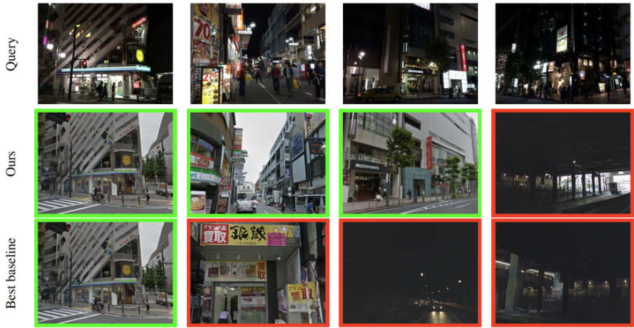 마지막으로 정성적 결과입니다. 논문에서는 12개 case에 대한 정성적 결과를 담고 있었는데 위 그림의 마지막 열을 제외한 나머지(11개의 결과)는 같은 이미지에 대해 Best baseline은 recognition을 잘 못하고 있는 것에 비해 잘 retrieval한 것을 보입니다. 마지막 열을 보면 전체적으로 어두운 query image이기 때문에 저자가 제안한 방식으로는 어려운 query에 해당한다고 합니다.