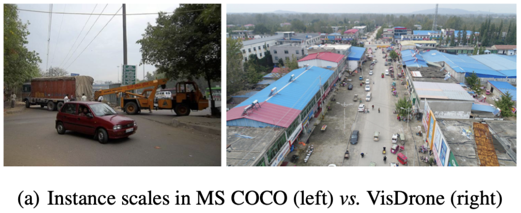그 문제점으로 첫 번째는 드론 이미지는 많은 수의 작은 사이즈의 물체를 포함합니다. 이는 드론이라는 특성, 즉 공중에서 촬영했기에 그만큼 FoV와 ViewPoint를 생각하면 영상 내 Instance를 많이 포함한다는 점도, Instance의 사이즈가 작다는 점을 충분히 납득할 수 있습니다. Pascal VOC나 MS COCO는 지상에서 촬영한 영상을 다루고 있었으며, 따라서 드론 영상을 대상으로 하는 detection 연구가 활발하지 않았다는 점도 납득될만합니다. 그도 그럴 것이, Pascal VOC나 MS COCO는 2010년과 2014년에 나온 데이터 셋인 반면, 드론 이미지 데이터 셋의 대표격인 VisDrone은 2019년에 나왔기 때문입니다. 아래 사진 (a)를 통해 확인하시면 좋습니다.
