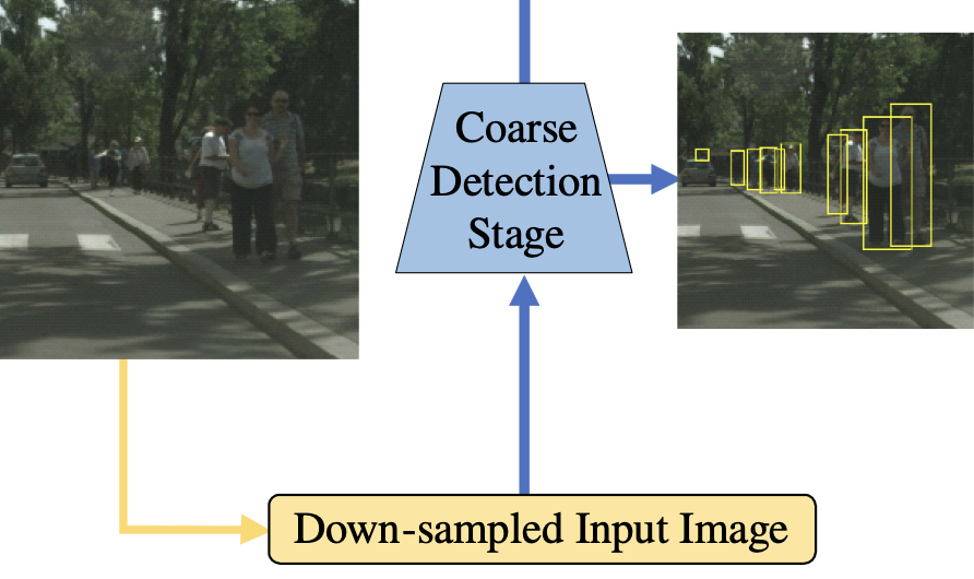 coarse-to-fine detection 방법론은 2019년에 등장하였으며 처음 들었을 때는 detector를 중첩해서 두어 속도 측면에서 비효율성이 높지 않을까 생각하여 해당 방법론을 사용한 논문을 몇 편 살펴보았으며, 대표적으로 아래 그림을 살펴보면 Coarse Detection Stage 이전에 영상을 다운샘플링 (Down-sampling)하는 모습을 통해 computing resource 및 효율성에서의 측면을 고려한 방법 혹은 단순히 CNN 두-세 층만을 쌓은 방법도 존재합니다. 해당 파이프라인의 장점은 다른 성격을 갖는 두 detector를 통해 전략을 세울 수 있다는 점입니다.