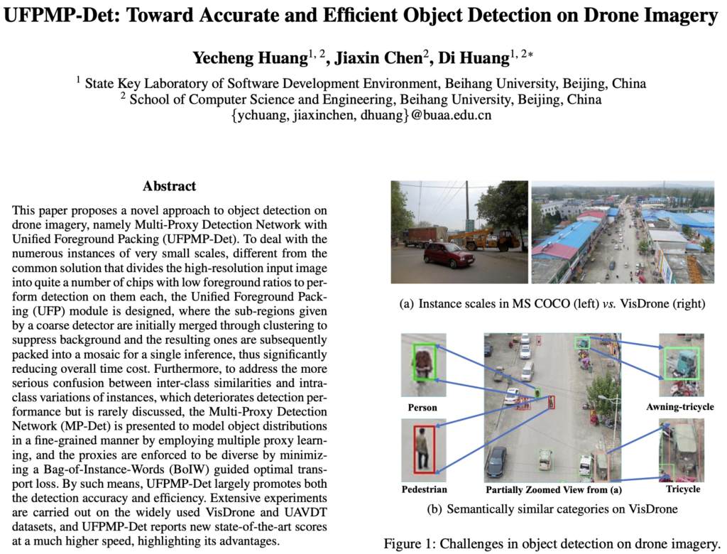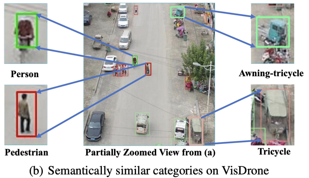 두 번째 문제점으로 VisDrone 등의 데이터 셋을 살펴보면 object의 몇몇 클래스가 의미론적으로 굉장히 비슷하다는 점입니다. 예를 들어 아래 사진 (b)를 보면, person과 pedestrian, Awning-tricycle(천막 세발자전거)과 tricycle은 다른 클래스로 분류되어있지만 의미론적으로 보면 혼동이 옵니다. 그 뿐만이 아니라 비행 고도, 시야각, 기상 환경, instance와의 거리 차이 (하나의 클래스, 예를 들어 person이라고 해도 ViewPoint에 따라 크게 보일 수도, 작게 보일 수도 있습니다) 등의 장애물 요소 또한 문제점 중 하나입니다.