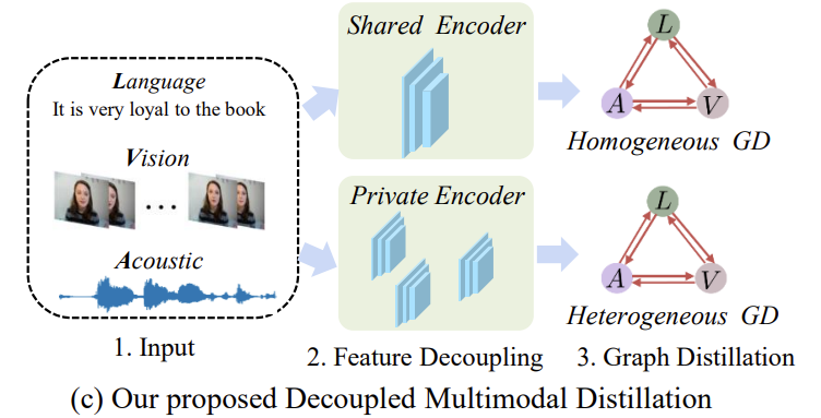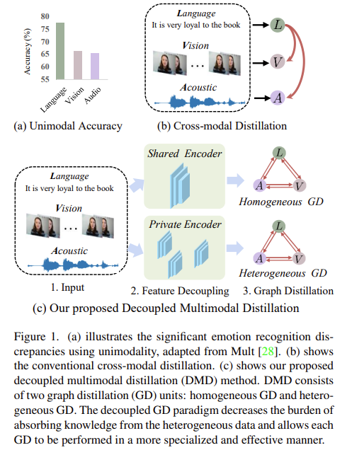 - we propose a decoupled multimodal distillation framework, Decoupled Multimodal Distillation (DMD), to learn the dynamic distillations across modalities for robust MER. In DMD, we explicitly decouple the multimodal representations into modality-irrelevant/-exclusve spaces to facilitate KD on the two decoupled spaces. DMD provides a flexible knowledge transfer manner where the distillation directions and weights can be automatically learned, thus enabling flexible knoweldge transfer patterns.