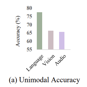 Figure 1에 (a)를 확인해보면 Language쪽이 훨씬 성능이 높은 것을 확인할 수 있죠. 논문에서는 이러한 불균형이 multimodal representation learning을 힘들게 한다고 생각하였습니다.