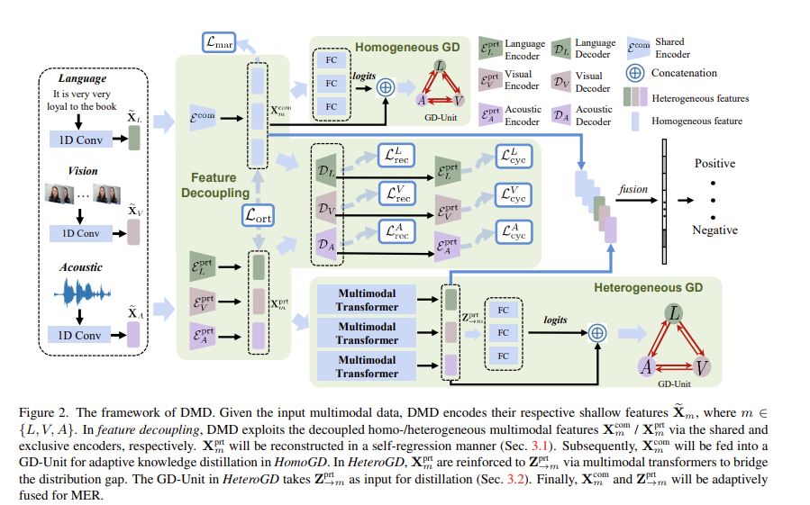 논문의 저자들은 modality의 distribution mismatch를 고려하고자 shared multimodal encoder와 exclusive multimodal encoder를 이용하여 multimodal representation을 homogeneous multimodal features, heterogeneous multimodal features로 분리합니다. 그런다음 flexible knowledge transfer를 쉽게하기 위해서, HomoGD와 HeteroGD로 구성된 homo/heterogeneous feature에서 knowledge를 distill합니다. HomoGD에서, homogeneous multimodal features는 mutually distilled되어서 서로에 대한 representation ability를 보완합니다. HeteroGD에서는, multimodal transformers가 사용되는데, 이를 통해 명시적으로 inter-modal correlations와 semantic alignment를 구축합니다. 최종적으로, ditilling을 통해 refined multimodal features를 fuse하여 감정인식을 수행합니다.