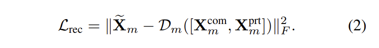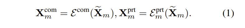 multimodal features를 homogeneous (modality-irrelevant) part X_m^{com}과 heterogeneous (modality-exclusive) part X_m^{prt}로 분리하기 위해서, shared multimodal encoder \varepsilon^{com}와 3개의 private encoder \varepsilon^{prt}_m를 이용합니다. shared multimodal encoder와 private encoder는 decoupled된 feature를 예측합니다. 수식으로 표현하면 수식(1)과 같습니다.