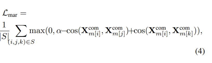 하지만 논문에서는 위의 reconstruction losses만으로는 여전히 완전한 feature decoupling을 보장할 수 없다고 합니다. 사실, information은 representation 간에 자유롭게 유출될 수 있다고 논문에서는 말하는데, 예를 들어, 모든 modality 정보는 단순히 X_m^{prt}로 인코딩되어 디코더가 쉽게 합성할 수 있으므로 homogeneous multimodal features는 무의미합니다. feature decoupling을 통합하기 위해서, 논문에서는 이렇게 말하는데요. 같은 emotion이지만 다른 modality에서 온 homogeneous representation이 다른 emotion 이지만 같은 modality에서 온 representation과 비슷해져야 한다고 주장합니다. 그래서 margin loss를 아래와 같이 설계하였습니다.