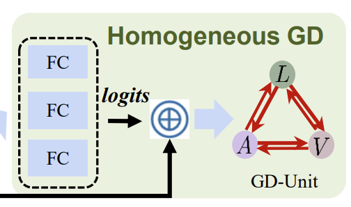 위의 그림은 Figure 2에서 Homogeneous GD 파트를 crop해서 가져온 것입니다. decoupled homogeneous feature X_m^{com}에 대해서, modality간의 distribution gap이 이미 충분히 줄어들었기 때문에, 논문의 저자는 feature X_m^{com}과 대응되는 logits f(X_m^{com})를 GD-Unit의 input으로 주고 graph edge matrix W와 distillation loss matrix E를 수식(8)에 따라서 계산합니다. 그런 다음 전체적인 distillation loss \mathcal{L}^{homo}_{dtl}은 자연스럽게 수식(9)를 통해서 얻을 수 있습니다.