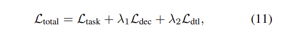 여기서 \mathcal{L}_task는 emotion task 관련된 loss를 의미하고, \mathcal{L}_{dtl} = \mathcal{L}_{dtl}^{homo} + \mathcal{L}_{dtl}^{hetero}는 HomoGD와 HeteroGD의해서 생성된 distillation loss를 의미하고, \lambda_1, \lambda_2는 다른 constraints의 중요성을 control하는 역할을 합니다.