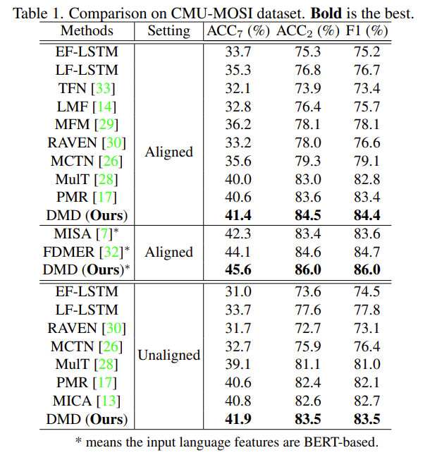 이 두개의 데이터셋은 word-aligned 버전과 unaligend 버전 두가지가 있는데 논문에서는 두 버전의 데이터셋을 비교하여 실험했다고 합니다. 논문에서는 성능 리포팅할 때 3개의 metrics를 사용하는데 ACC_7 (7-class accuracy), ACC_2 (binray accuracy) 그리고 F1 Score 입니다.