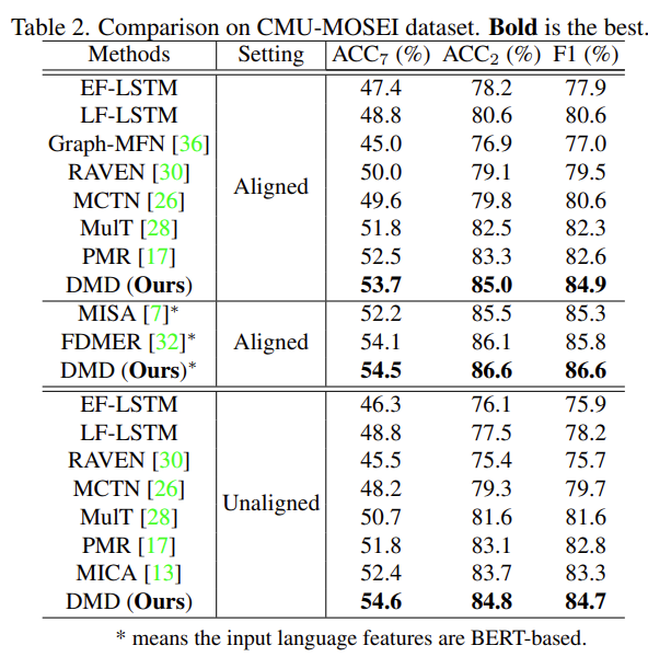 DMD는 crossmodal interaction을 학습하고 multimodal fusion을 수행한 13, 17, 28 방법론에서 좋은 성능을 보였는데 논문의 저자는 두가지의 이유를 말합니다.
