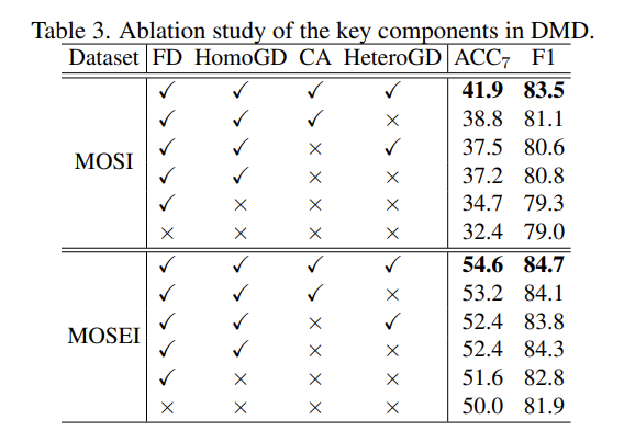 ablation study에서는 feature decoupling (FD), HomoGD, crossmodal attention unit (CA), HeteroGD 이렇게 4가지 요소에 대해서 ablation을 진행하여 정량적으로 성능을 측정하였습니다. (Table 3 참고)