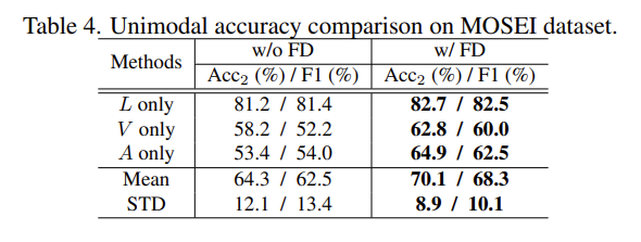 FD는 MER 성능을 크게 향상시켰는데요. 이것을 더 디테일하게 알아보기 위해서 Table 4로 FD가 있을 때와 없을 때를 비교하여 성능을 측정하였습니다. Table 4를 통해서, FD가 각 unimodality에게 consistent improvement를 가져왔다는 것과, 3개 modality에서 performance gap이 줄었다는 것을 확인할 수 있습니다.