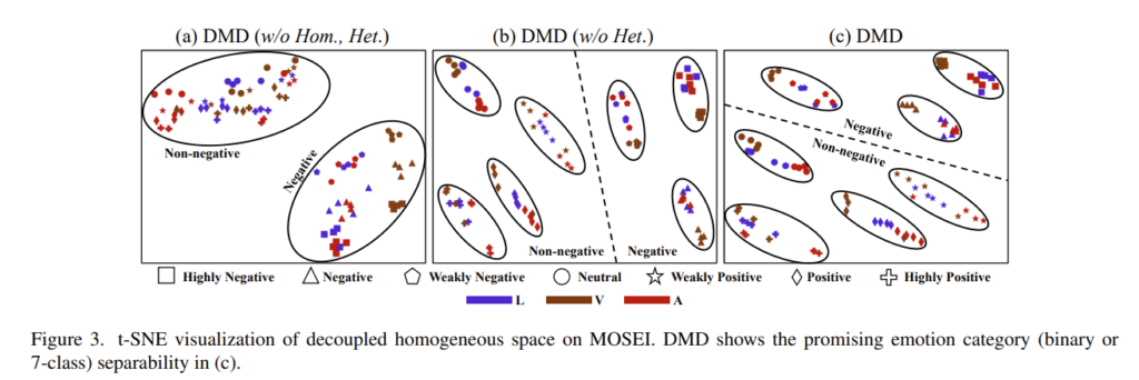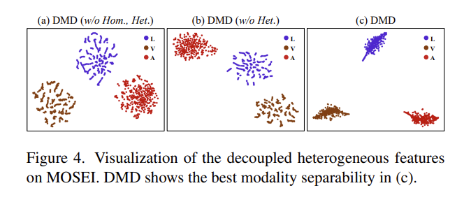 또한 논문의 저자는 t-SNE를 시각화하여 얼마나 잘 분류하는지에 대해서 확인하였는데요. 모든 요소가 다 갖춰져 있는 DMD가 가장 분류가 깔끔하게 되는 것을 확인할 수 있습니다. Figure 4는 각 modality 마다 분류가 아주 깔끔하게 되어 있는 모습을 확인할 수 있는데 정말 대단한 것 같습니다.